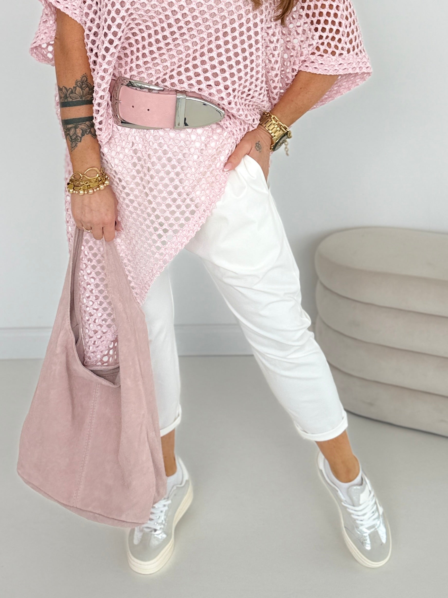 Un look tendance avec des détails asymétriques en crochet sur les côtés